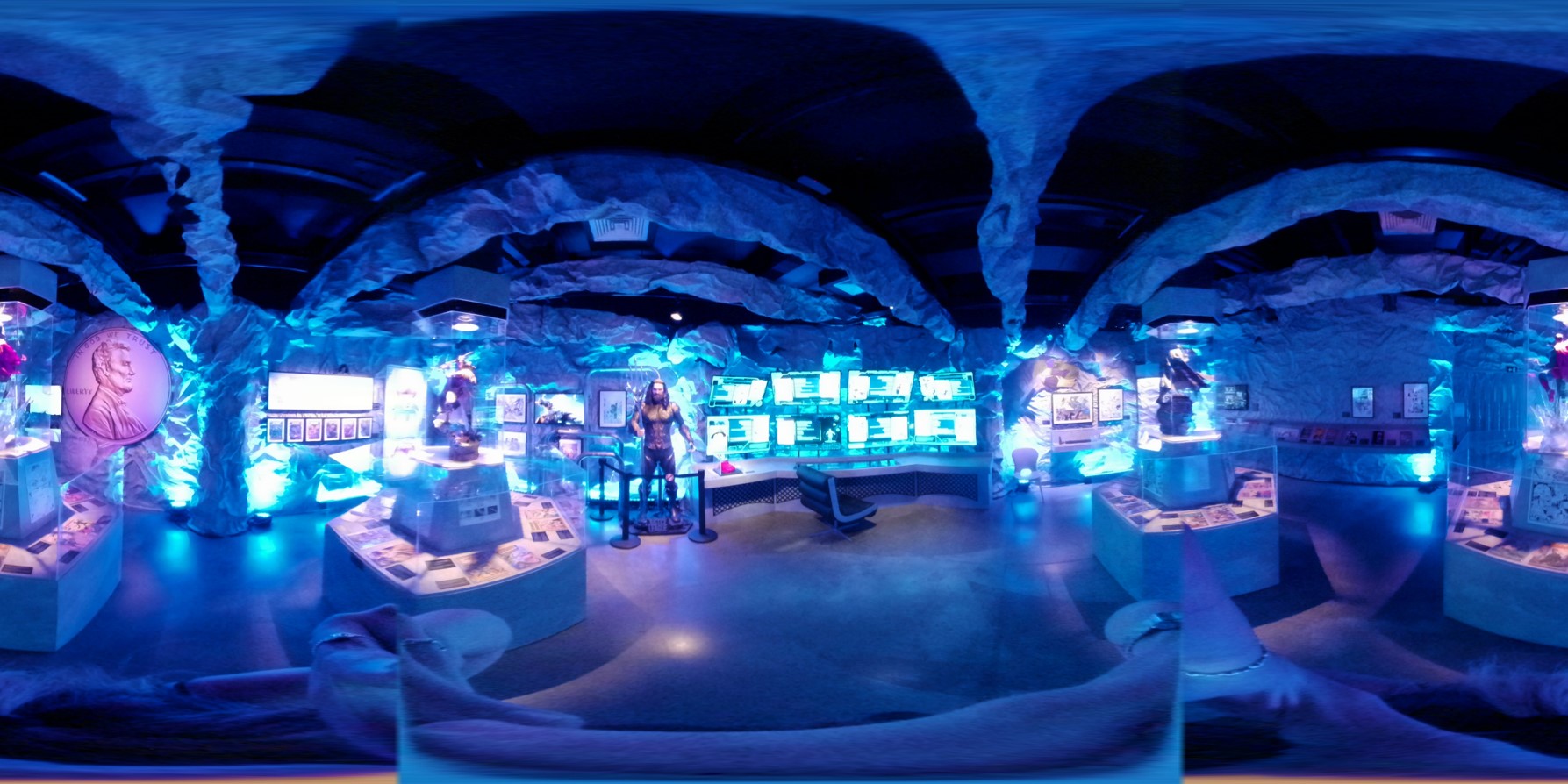 Foto em 360º da sala da DC Comics, onde há uma mesa de controle do Batman